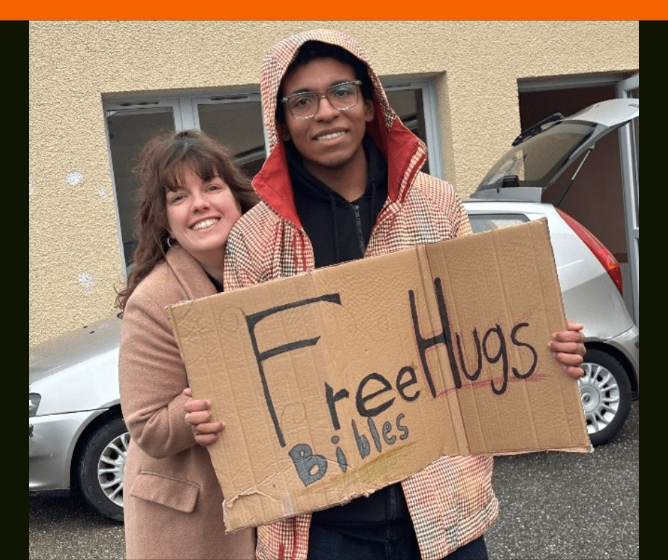 Le soir venu, l’équipe complète — étudiants, enseignants et membres de JEM Provence et JEM Lyon — s’est retrouvée autour du Temple du Change, dans le Vieux Lyon, pour la première soirée de distribution de Bibles.